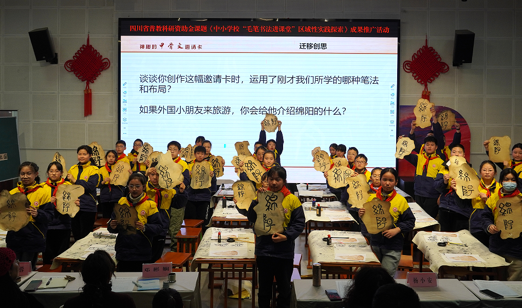 安州區(qū)“七一”實驗小學劉冬梅老師執(zhí)教《兩橫并排》,通過“觀察-臨摹-創(chuàng)作”三階教學,引導學生從“二”“云”中習得行筆方法,課堂融入文創(chuàng)產(chǎn)品創(chuàng)作,激發(fā)學生對傳統(tǒng)文化的深度認同;東辰聚星學校姬加良老師以《神秘的甲骨文》為題,在層層探究中體會線條、結(jié)構(gòu)、布局之美,學生創(chuàng)寫“綿陽”的甲骨文,實現(xiàn)“文墨雙修”;東辰一小余濫老師則圍繞《精品課設(shè)計及制作經(jīng)驗》進行分享,為現(xiàn)場教師提供了實用的教學參考。