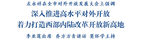 左永祥在講話中指出,黨的十八大以來,習(xí)近平總書記統(tǒng)籌國內(nèi)國際兩個(gè)大局,親自謀劃推動(dòng)對(duì)外開放工作,創(chuàng)造性提出一系列新思想新觀點(diǎn)新論斷,特別是賦予四川構(gòu)筑向西開放戰(zhàn)略高地和參與國際競爭新基地的使命任務(wù),標(biāo)定了四川在全國開放大局中新的方位坐標(biāo)。省委、省政府堅(jiān)持把擴(kuò)大高水平對(duì)外開放作為治蜀興川的大事要事來抓,錨定“一高地一基地”目標(biāo)任務(wù),提出“西拓、南進(jìn)、東接、北融”的方針。全市上下要進(jìn)一步提高認(rèn)識(shí)、統(tǒng)一思想,切實(shí)增強(qiáng)高水平對(duì)外開放的責(zé)任感緊迫感,堅(jiān)持通道建設(shè)與平臺(tái)建設(shè)、穩(wěn)定出口與擴(kuò)大進(jìn)口、“引進(jìn)來”與“走出去”相結(jié)合,堅(jiān)定不移擴(kuò)大對(duì)外開放,積極服務(wù)和融入新發(fā)展格局,努力開創(chuàng)高水平開放引領(lǐng)高質(zhì)量發(fā)展新局面。