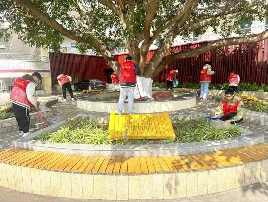 得英大道旁,同學(xué)們手持工具,為校園主干道的花草“梳妝打扮”:修剪枯枝、清理雜草、松土澆水……協(xié)作間,花兒開(kāi)得更艷、樹(shù)葉顯得更翠。綠化校園、守護(hù)校園的綠意是該校每個(gè)人的責(zé)任。