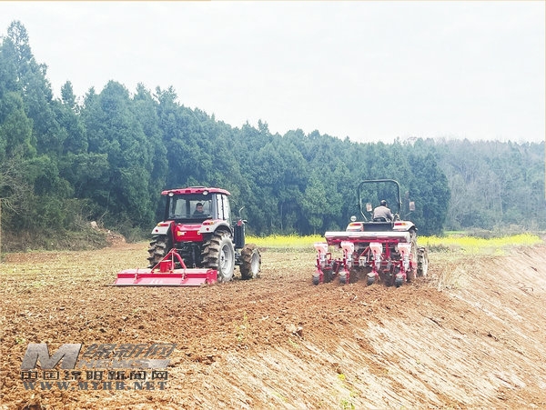 在鵝溪鎮(zhèn)黃金溝村,種糧大戶曹洪源正指揮著3臺(tái)旋耕機(jī)在田間作業(yè)。田地里,鐵犁翻起黝黑的新土,空氣中彌漫著泥土的芬芳。