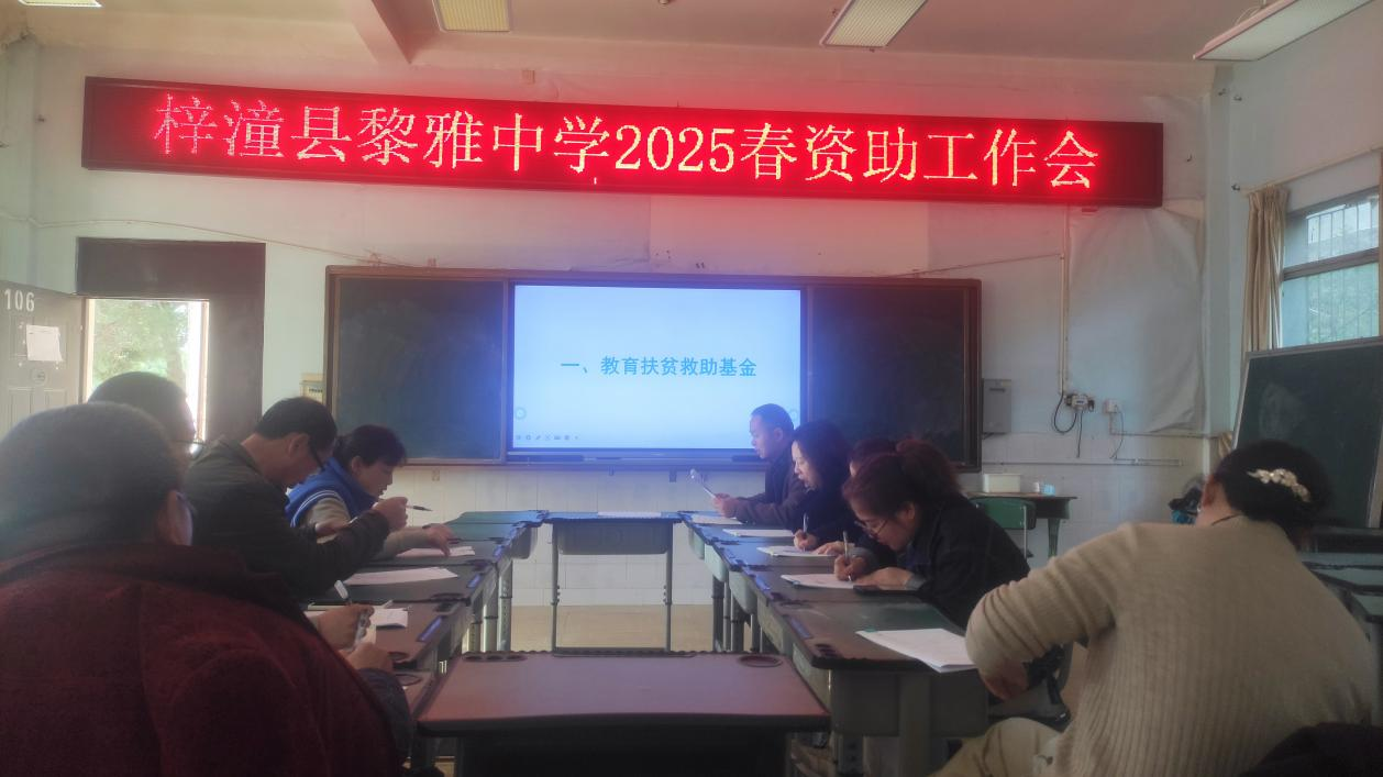 2025年初春,梓潼縣黎雅中學召開了以“資助政策深鉆研,育人路上行致遠”為主題的2025年春季學期資助工作專項會議。會議由校總務處牽頭,全體班主任及資助工作教師齊聚一堂,共同研讀政策細則。