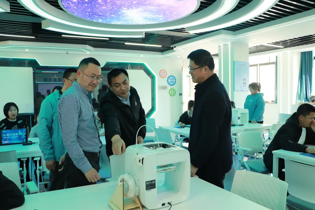 湯榮生到三臺中學AI創(chuàng)客實驗室、天文館、理化生頂裝實驗室、數字化探究實驗室實地查看、觀摩訪談,就學??茖W實驗課程的開設,地理學科教室與天文館的科普基地建設情況進行了仔細調研,并高度評價了該校積極組織師生及教職工子女在三臺中學天文館進行天文觀測等對青少年科普教育主動作為的工作。