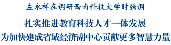 綿陽新聞網(wǎng)訊 4月7日,副省長(zhǎng)、市委書記左永祥前往西南科技大學(xué)調(diào)研。他強(qiáng)調(diào),要深入學(xué)習(xí)貫徹習(xí)近平總書記關(guān)于教育的重要論述和對(duì)四川工作系列重要指示精神,全面落實(shí)黨中央、國(guó)務(wù)院和省委、省政府部署要求,緊緊圍繞立德樹人根本任務(wù),扎實(shí)推進(jìn)教育科技人才一體發(fā)展,為加快建成省域經(jīng)濟(jì)副中心貢獻(xiàn)更多智慧力量。