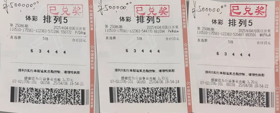 4月6日,體彩排列5第25086期開獎,開獎號碼為:63444。位于綿陽市長虹大道北段89號隆盛春天花園二期中國體育彩票5107021376銷售點傳來喜訊,一位幸運的購彩者在此斬獲15注當期排列5一等獎,獎金合計150萬元。