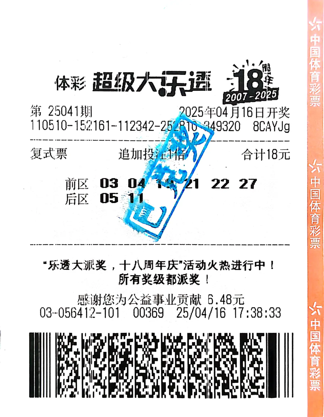 4月16日,大樂透第25041期開獎號碼:03 04 21 22 27+05 11,四川自貢市沿灘新城龍湖美食街36號鋪5103056412體彩銷售點傳來了捷報,一幸運購彩者中出1注大樂透一等獎,此次中獎?wù)?025年超級大樂透8.8億大派獎活動期間,這位幸運兒在本期總共獲得中獎獎金1670萬,驚喜翻倍!