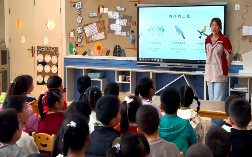 “雨生百谷,萍始生,鳴鳩拂羽……”稚嫩的童聲應和著輕快的節(jié)拍,孩子們在《谷雨謠》手勢舞中化身“節(jié)氣小使者”,感受“時雨乃降,五谷百果乃登”的自然哲思。