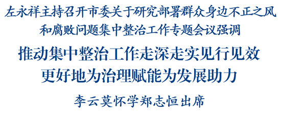 左永祥指出,要壓緊壓實政治責任,構(gòu)建齊抓共管的工作格局。市級領導要主動擔責、親自研究,各級黨委要切實扛起主責,各級政府要狠抓問題治理解決,各職能部門要按照“管業(yè)務必須強監(jiān)管”要求加強條線工作指導,各級紀委監(jiān)委既要認真履行監(jiān)督專責,又要發(fā)揮牽頭抓總作用,發(fā)動各方面力量形成工作合力。要把深化整治與深入貫徹中央八項規(guī)定精神學習教育結(jié)合起來,與整治形式主義為基層減負結(jié)合起來,與市委中心工作結(jié)合起來,切實把整治成效轉(zhuǎn)化為高質(zhì)量發(fā)展實效。