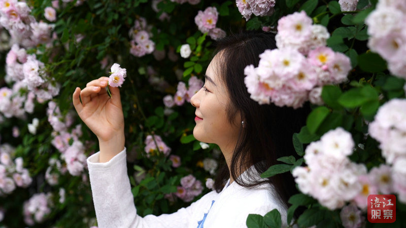 在李白少年求學的大匡山下,大康鎮(zhèn)集鎮(zhèn)正沉浸在一片花紅柳綠的詩意之中。主干道兩側(cè),薔薇藤蔓纏綿交織,蜿蜒出數(shù)百米的繽紛“花廊”。雪白與粉紅的花朵層層疊疊,宛如傾瀉的云霞,又似溫柔的錦緞,引得游人紛紛駐足,用鏡頭定格這抹絢麗。