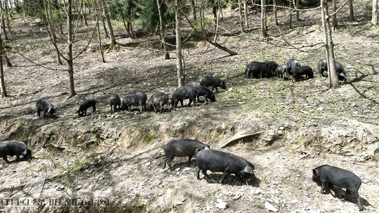 林下放養(yǎng)的“川藏黑豬”主要以山上的野菜、野果為食,輔助玉米,平時都在山林里活動。由于是在林下放養(yǎng),“川藏黑豬”的生長周期要比圈養(yǎng)土豬多出一倍多,出欄時間要1年半以上。按這種方式放養(yǎng)的“川藏黑豬”運(yùn)動量大,肉質(zhì)鮮美,吃起來肥而不膩、回味無窮,深受消費者喜愛。