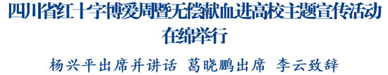 綿陽新聞網(wǎng)訊 5月7日,在第78個“世界紅十字日”來臨之際,由省紅十字會、省衛(wèi)生健康委、省教育廳、團省委聯(lián)合主辦的四川省紅十字博愛周暨無償獻血進高校主題宣傳活動在綿舉行。副省長、省紅十字會會長楊興平出席講話并看望慰問無償獻血師生,省政府副秘書長葛曉鵬出席,市委副書記、市長李云致辭。