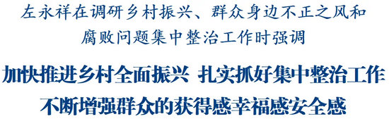 調(diào)研過(guò)程中,左永祥強(qiáng)調(diào),要學(xué)習(xí)運(yùn)用“千萬(wàn)工程”經(jīng)驗(yàn),扎實(shí)做好全市“三農(nóng)”各項(xiàng)工作,持續(xù)鞏固拓展脫貧攻堅(jiān)成果,推進(jìn)鄉(xiāng)村全面振興取得新成效。要深入實(shí)施新一輪糧食產(chǎn)能提升行動(dòng),積極發(fā)展現(xiàn)代種業(yè),務(wù)實(shí)抓好高標(biāo)準(zhǔn)農(nóng)田建設(shè),堅(jiān)守耕地保護(hù)紅線,加快建設(shè)新時(shí)代更高水平“天府糧倉(cāng)”綿陽(yáng)片區(qū)。要培育壯大鄉(xiāng)村產(chǎn)業(yè),加快發(fā)展農(nóng)業(yè)新質(zhì)生產(chǎn)力,統(tǒng)籌抓好農(nóng)業(yè)品種培優(yōu)、品質(zhì)提升、品牌打造,推進(jìn)現(xiàn)代農(nóng)業(yè)園區(qū)提質(zhì)擴(kuò)面,大力發(fā)展農(nóng)產(chǎn)品精深加工,推動(dòng)農(nóng)業(yè)“接二連三”融合發(fā)展,促進(jìn)鄉(xiāng)村產(chǎn)業(yè)全鏈條升級(jí)。要進(jìn)一步深化農(nóng)村改革,探索創(chuàng)新農(nóng)村閑置資產(chǎn)盤(pán)活利用模式,因地制宜發(fā)展壯大新型農(nóng)村集體經(jīng)濟(jì),建強(qiáng)農(nóng)村干部和人才隊(duì)伍,做實(shí)鄉(xiāng)村發(fā)展要素保障,不斷增強(qiáng)鄉(xiāng)村振興活力。要著力提升鄉(xiāng)村建設(shè)和治理水平,統(tǒng)籌抓好村容村貌提升、路域環(huán)境整治、基礎(chǔ)設(shè)施完善等工作,進(jìn)一步優(yōu)化鄉(xiāng)村公共服務(wù)供給,抓好鄉(xiāng)風(fēng)文明建設(shè),推進(jìn)平安鄉(xiāng)村建設(shè),讓群眾安居樂(lè)業(yè)。開(kāi)展群眾身邊不正之風(fēng)和腐敗問(wèn)題集中整治,是推動(dòng)全面從嚴(yán)治黨向基層延伸、增進(jìn)民生福祉的重要舉措,各級(jí)各部門(mén)要樹(shù)牢和踐行造福人民的政績(jī)觀,緊盯民生痛點(diǎn)難點(diǎn),結(jié)合開(kāi)展深入貫徹中央八項(xiàng)規(guī)定精神學(xué)習(xí)教育,縱深推進(jìn)集中整治,以有力舉措推動(dòng)重點(diǎn)任務(wù)落到實(shí)處,更好為治理賦能、為發(fā)展助力。