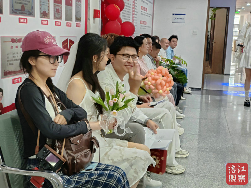 在涪城區(qū)民政局婚姻登記處,一對對新人有序排隊辦理婚姻登記,現場貼心為新人們準備了礦泉水和各種美味糕點,還有專業(yè)的攝影師為大家拍照。