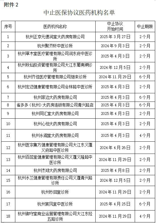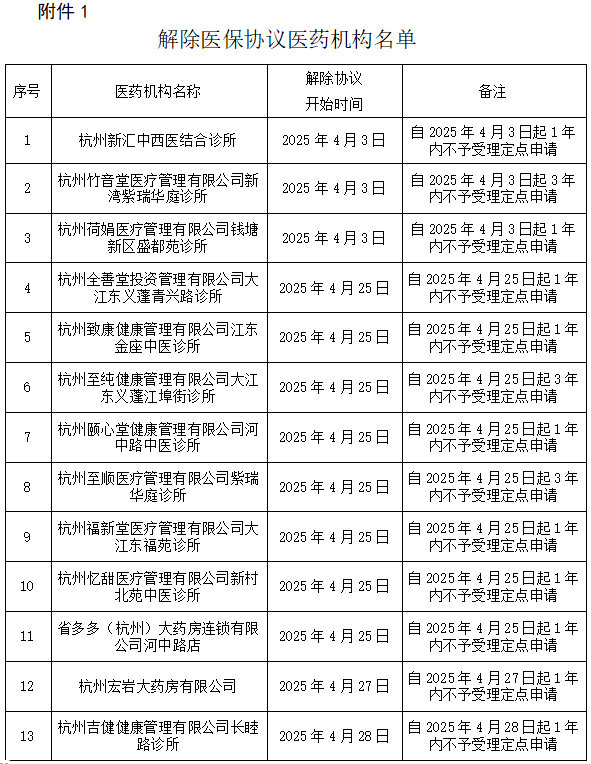 解除杭州新匯中西醫(yī)結(jié)合診所等13家單位(附件1)的杭州市醫(yī)療保障定點醫(yī)藥機構(gòu)服務(wù)協(xié)議。