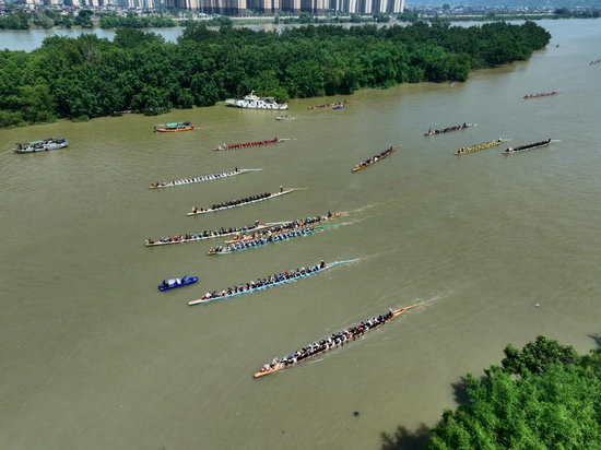5月31日,在福州市閩侯縣大樟溪南港段,民間龍舟隊在端午競渡活動中比拼(無人機照片)。新華社記者 姜克紅 攝