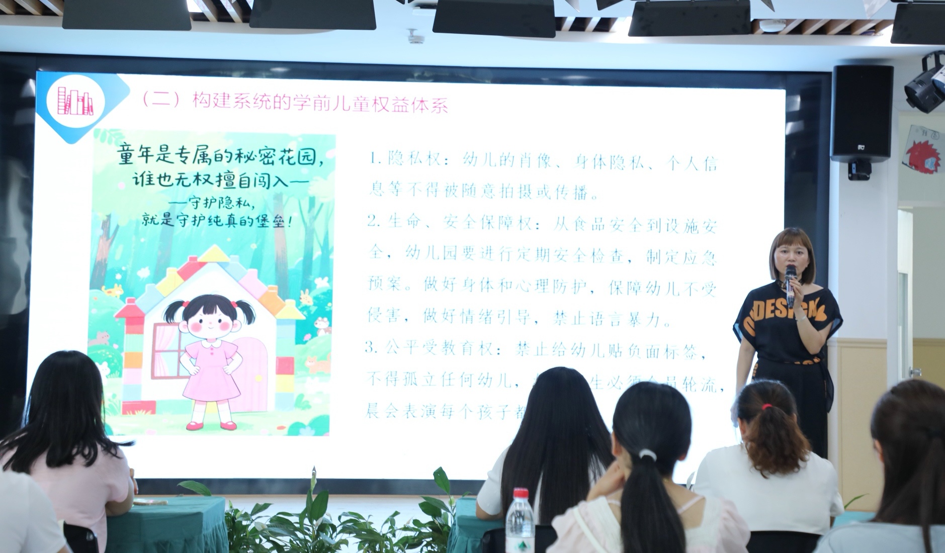 北街幼兒園園長馬紅梅作了《以最有利于學(xué)前兒童原則》主題報(bào)告,她首先從國內(nèi)政策法規(guī)的發(fā)展演進(jìn),國際法原則和精神的形成,溯源“最有利于兒童原則”的由來;接著圍繞《中華人民共和國學(xué)前教育法》(以下簡稱《學(xué)前教育法》)構(gòu)建的有力的學(xué)前教育支持體系、系統(tǒng)的學(xué)前兒童權(quán)益體系、科學(xué)的學(xué)前教育內(nèi)容體系等三方面進(jìn)行詳細(xì)解讀;最后特別介紹了“以愛為核心”“以游戲?yàn)榛净顒?rdquo;的學(xué)前教育實(shí)踐。