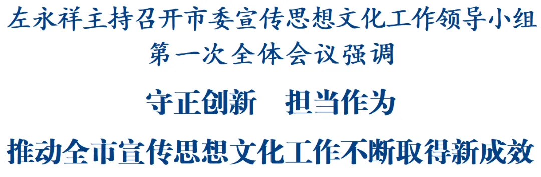 會議指出,市委宣傳思想文化工作領導小組要認真履行牽頭抓總職責,堅決把黨管宣傳、黨管意識形態(tài)、黨管媒體原則貫穿工作始終。領導小組辦公室要加大統(tǒng)籌協(xié)調(diào)力度,強化督促指導和跟蹤問效,確保各項重點任務落到實處、見到實效。領導小組成員單位要強化配合、主動作為,把各自領域工作抓實抓細抓具體,形成上下協(xié)同、齊抓共管的工作格局。