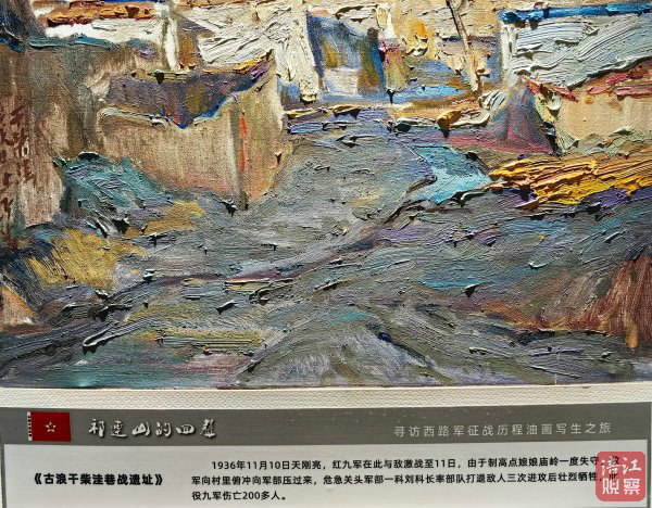 繪畫《石窩會議遺址》講述了1937年紅軍西路軍歷經(jīng)數(shù)月苦戰(zhàn),被迫轉(zhuǎn)移祁連山石窩鄉(xiāng),在3月14日傍晚召開“石窩會議”的歷史記憶;《永昌八壩狙擊戰(zhàn)遺址》再現(xiàn)的是1936年11月25日至28日,西路軍在永昌境內(nèi)取得唯一一次重大勝利的歷史;《西路軍最后一戰(zhàn)遺址》再現(xiàn)的是,西路紅軍于1937年4月突出重圍向西北轉(zhuǎn)移的歷史……