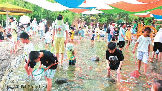 如果說方特的潑水節(jié)充滿狂歡氛圍,那么蝸牛部落的夏日戲水則充滿了童趣。這里精心打造了戲水樂園、趕海樂園以及玩水主題活動。在樹蔭遮蔽的淺水池中,小朋友們赤腳踩在清涼溪水里摸蟹、抓泥鰍、撈小魚,樂趣無限。在稍深的水域,“渾水摸魚”活動更是將歡樂氛圍推向高潮。工作人員現(xiàn)場將大魚投放在渾水區(qū),隨著一聲令下,孩子們和家長沖進(jìn)水里,圍堵四處逃竄的魚。有的小朋友成功抓到魚后,滿臉自豪地向父母展示;也有的小朋友在水中手忙腳亂,卻怎么也抓不住靈活的魚兒?,F(xiàn)場驚叫聲、歡呼聲此起彼伏,充滿了童真與歡樂。