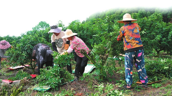 采收現場,工人爭分奪秒,動作嫻熟。他們頭戴遮陽帽,左手戴著厚實的手套,右手持電動剪刀,在花椒樹間穿梭忙碌。電動剪刀發(fā)出“咔嚓咔嚓”的聲響,一簇簇青花椒精準地剪下,被整齊碼放在旁邊袋子上,等待轉運。村民楊小林告訴記者,他們采收花椒是帶枝采收,采收后要對樹進行定型,定型的目的是為了讓它更好地發(fā)芽,為明年的花椒豐收做準備。