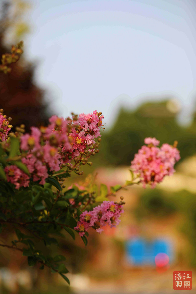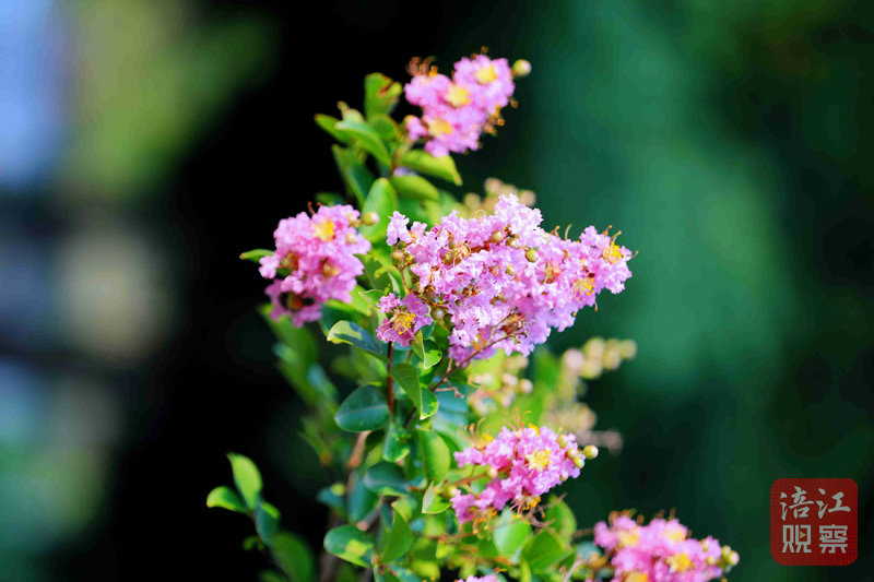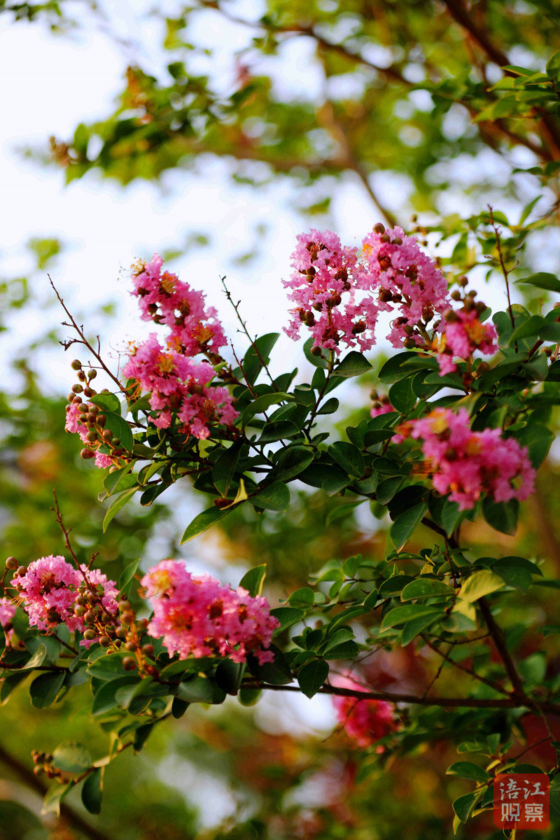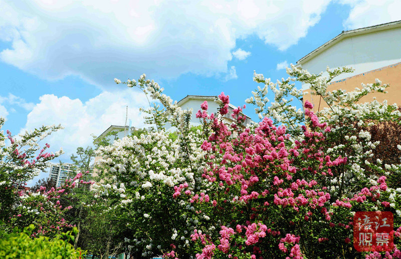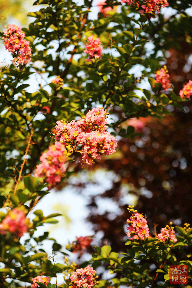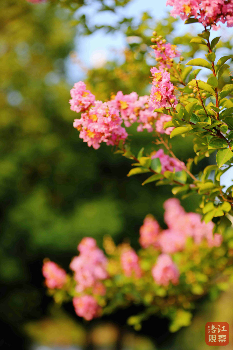 紫薇花綴滿枝頭,淡紫色、粉色的花朵層層疊疊,花瓣在陽(yáng)光下閃爍,微光晶瑩中透著含蓄朦朧之美,微風(fēng)拂過(guò),花枝輕搖,宛如靈動(dòng)的云霞,令人駐足流連。