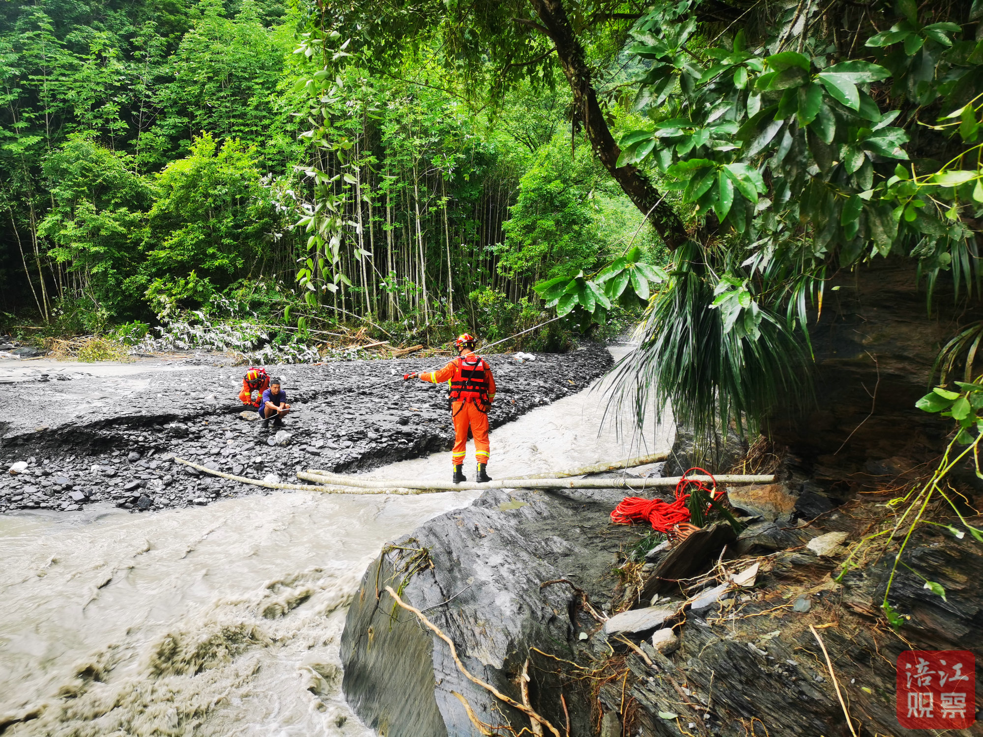 面對(duì)險(xiǎn)情,消防救援隊(duì)員迅速研判,決定就地取材,利用現(xiàn)場(chǎng)樹(shù)木、石塊等材料,爭(zhēng)分奪秒在湍急的水流上方搭建起一座簡(jiǎn)易便橋。這座臨時(shí)架設(shè)的“生命通道”為轉(zhuǎn)移被困群眾創(chuàng)造了關(guān)鍵條件。