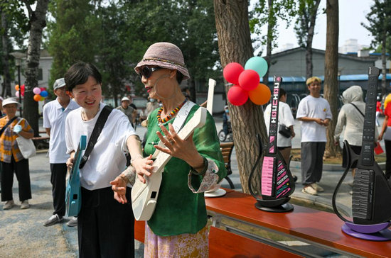 7月11日,老年人嘗試演奏“賽博吉他”。“賽博吉他”通過實現(xiàn)傳統(tǒng)吉他的數(shù)字化革新,降低了學習門檻。