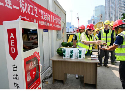 7月11日,在中鐵二局青島地鐵5號線青醫(yī)東站項目工地,工人在作業(yè)間歇領(lǐng)取西瓜。