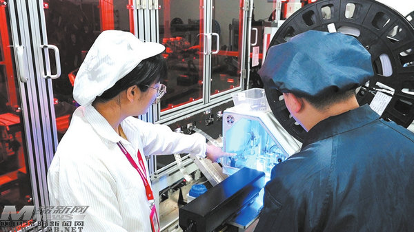 張歡歡(左)和同事對(duì)連接器外觀智能檢測(cè)系統(tǒng)運(yùn)行情況進(jìn)行檢查