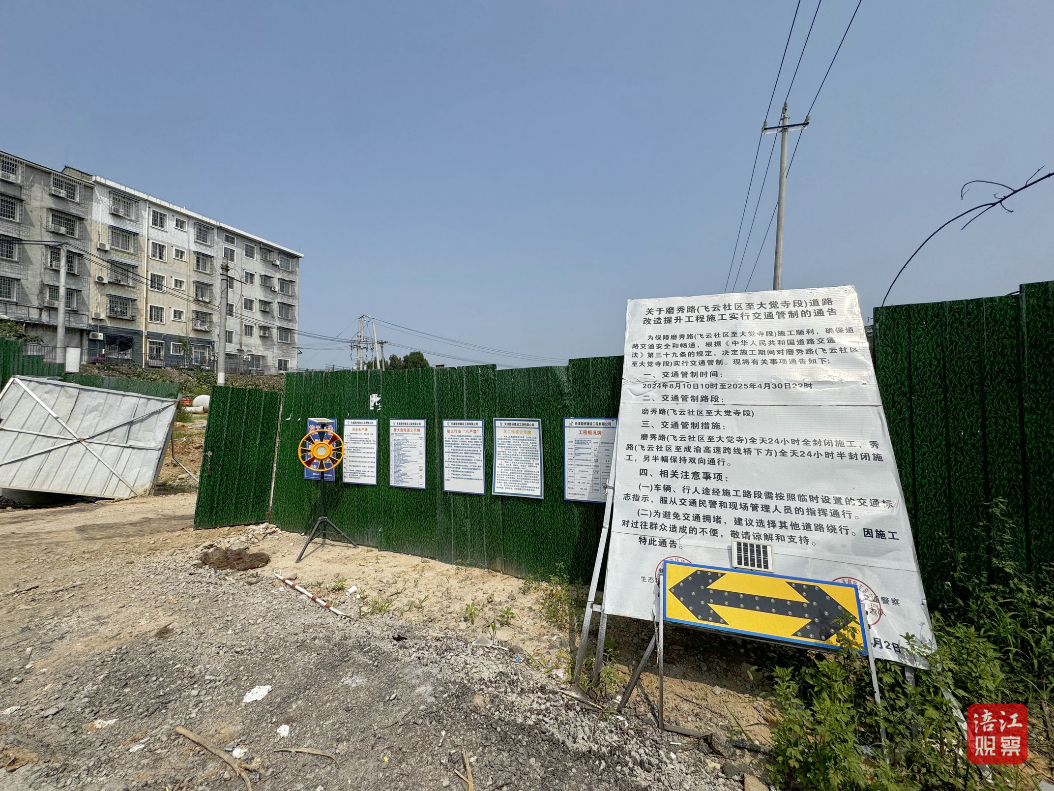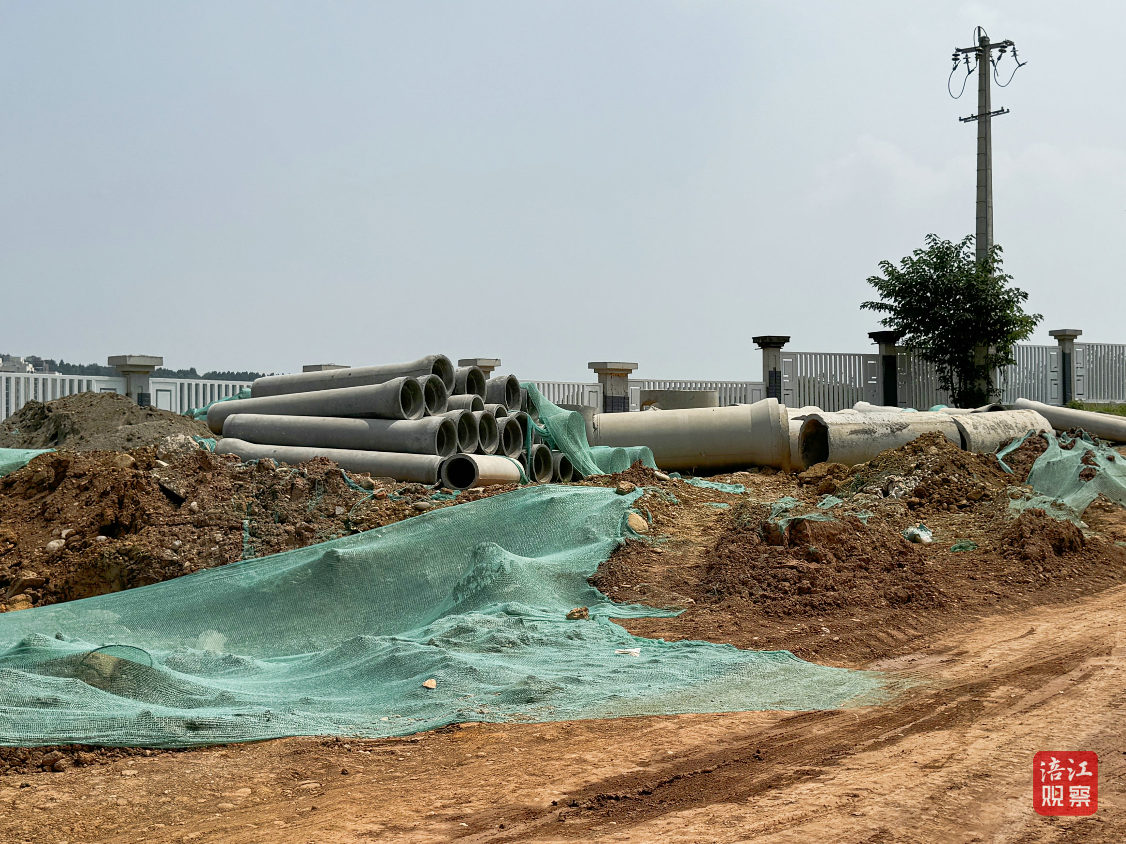 7月16日,記者在施工現(xiàn)場看到,圍擋處開了一道門,一條近200米長的黃土路直通施工區(qū)域,管道等材料隨意堆放在路邊,旋挖機(jī)正在橋梁處轟鳴作業(yè)?,F(xiàn)場的施工公告顯示,該施工項(xiàng)目為磨秀路道路改造提升工程和磨秀路跨草溪河橋梁工程,原計劃工期為2023年8月至2024年10月,但如今橋梁主體仍未完工,道路也未硬化。