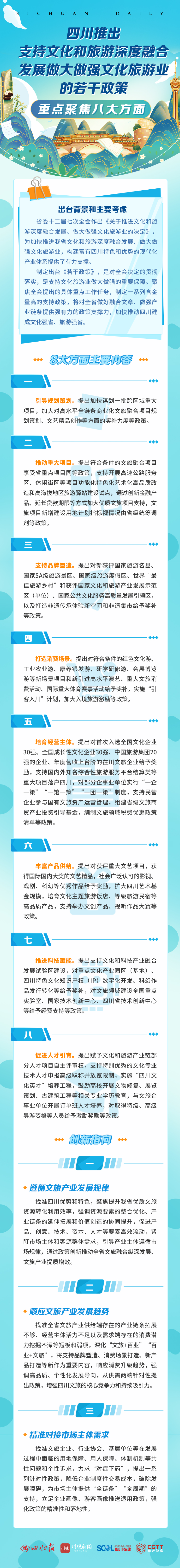 7月22日,記者從四川省文化和旅游廳官方網(wǎng)站獲悉,省委辦公廳、省政府辦公廳日前印發(fā)的《關(guān)于支持文化和旅游深度融合發(fā)展做大做強(qiáng)文化旅游業(yè)的若干政策》,從圍繞引導(dǎo)規(guī)劃策劃、推動重大項目、支持品牌塑造等8個方面,推出了一系列含金量高的支持政策,對全省做好文旅深度融合文章、做強(qiáng)產(chǎn)業(yè)鏈條提供強(qiáng)有力的政策支撐力。