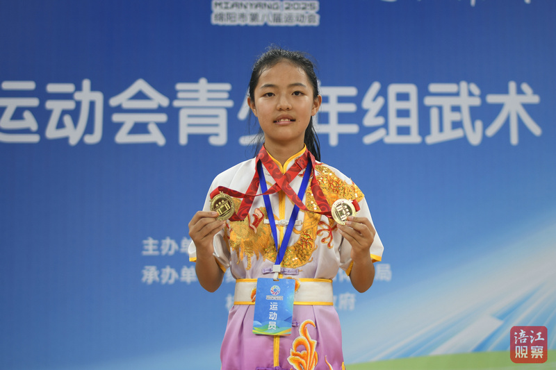 來自綿陽中學(xué)英才學(xué)校的小選手陶悅?cè)鸾衲?2歲,此次比賽獲得直屬學(xué)校小學(xué)女子甲組傳統(tǒng)拳、傳統(tǒng)器械2枚金牌。
