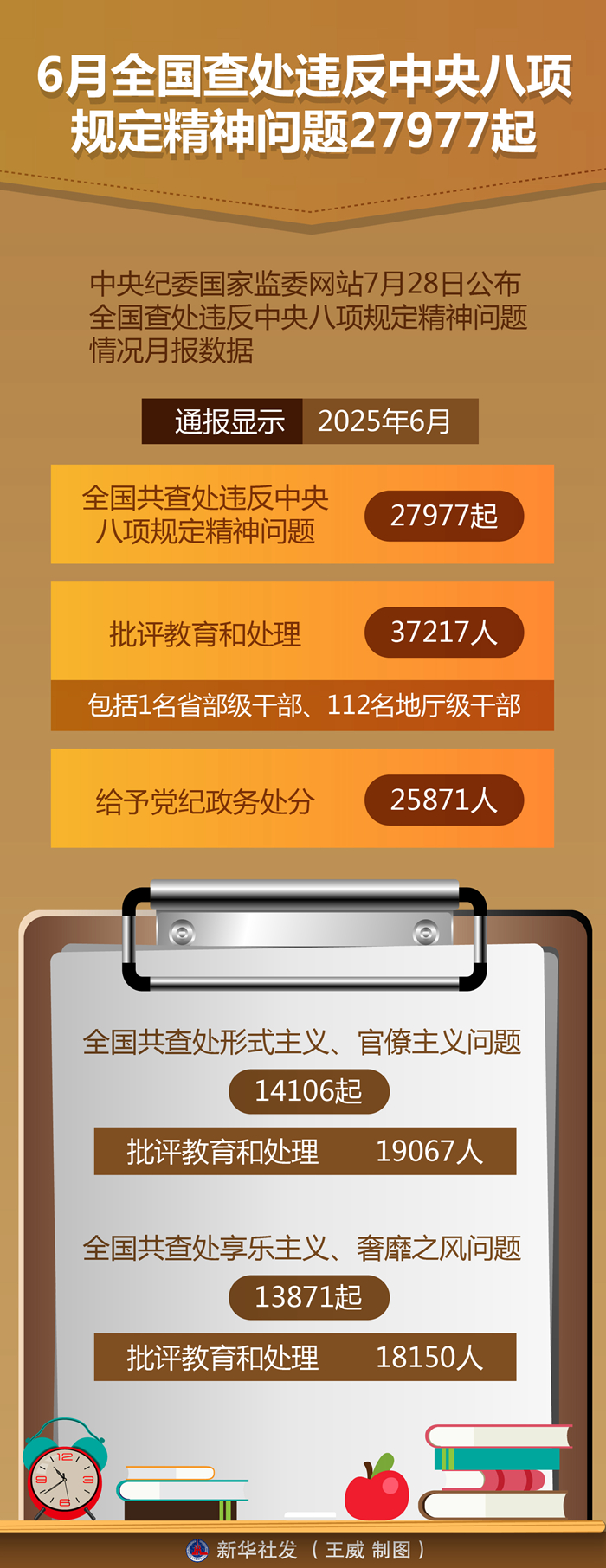 新華社北京7月28日電(記者孫少龍)中央紀(jì)委國(guó)家監(jiān)委網(wǎng)站28日公布全國(guó)查處違反中央八項(xiàng)規(guī)定精神問(wèn)題情況月報(bào)數(shù)據(jù)。通報(bào)顯示,今年6月,全國(guó)共查處違反中央八項(xiàng)規(guī)定精神問(wèn)題27977起,批評(píng)教育和處理37217人(包括1名省部級(jí)干部、112名地廳級(jí)干部),給予黨紀(jì)政務(wù)處分25871人。
