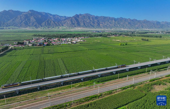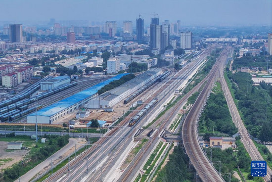 8月2日,檢測(cè)列車駛出包頭站(無(wú)人機(jī)照片)。新華社發(fā)