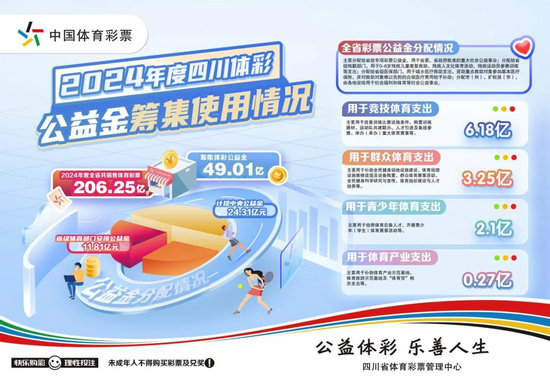 數(shù)據(jù)無言,卻最有力地詮釋著體彩公益的厚重分量。今年6月,四川省體育局發(fā)布了關(guān)于2024年度省級體育彩票公益金籌集使用情況的公告。公告指出,2024年度全省共銷售體育彩票206億元,籌集體彩公益金49.01億元,其中計提中央公益金24.31億元。