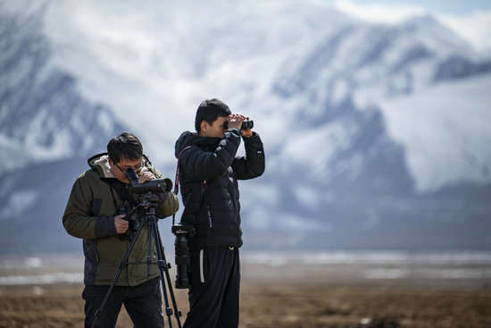 2023年3月1日,在拉薩市林周縣,楊樂(左)和同事正在觀察田間覓食的黑頸鶴。新華社記者孫非 攝