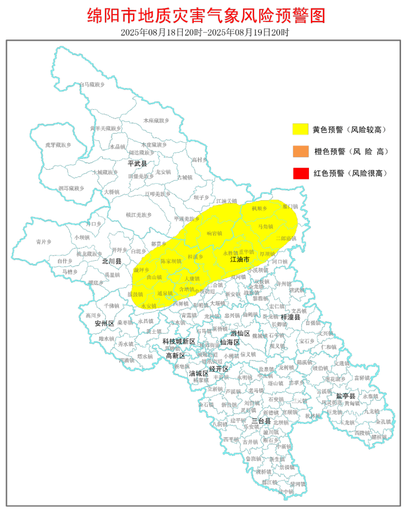 8月18日20時(shí)至19日20時(shí),北川羌族自治縣曲山鎮(zhèn)、擂鼓鎮(zhèn)、永安鎮(zhèn)、桂溪鄉(xiāng)、陳家壩鎮(zhèn)、通泉鎮(zhèn)、漩坪鄉(xiāng)、白坭鄉(xiāng)、都貫鄉(xiāng),平武縣響巖鎮(zhèn)、江油關(guān)鎮(zhèn)、豆叩羌族鄉(xiāng)、平通羌族鄉(xiāng),江油市中壩街道、太平鎮(zhèn)、三合鎮(zhèn)、含增鎮(zhèn)、武都鎮(zhèn)、大康鎮(zhèn)、雙河鎮(zhèn)、永勝鎮(zhèn)、小溪壩鎮(zhèn)、重華鎮(zhèn)、厚壩鎮(zhèn)、二郎廟鎮(zhèn)、馬角鎮(zhèn)、雁門鎮(zhèn)、西屏鎮(zhèn)、楓順鄉(xiāng)發(fā)生地質(zhì)災(zāi)害的風(fēng)險(xiǎn)較高(黃色預(yù)警),請(qǐng)重點(diǎn)防范。