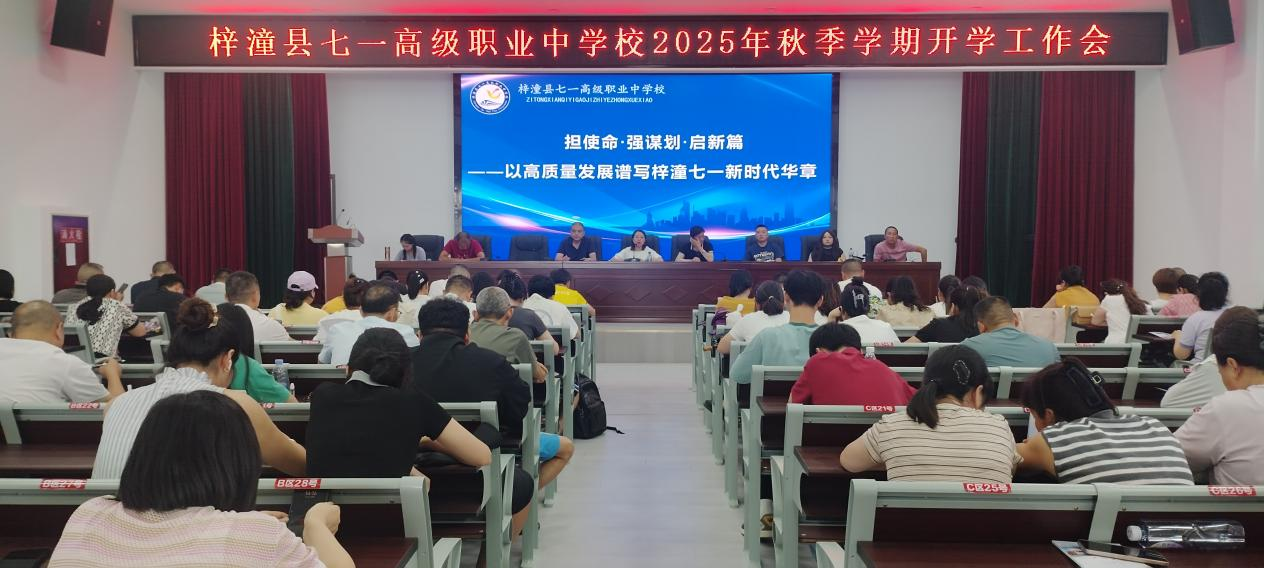 8 月 16 日,梓潼縣“七一”高級職業(yè)中學(xué)校召開了以“擔(dān)使命 強謀劃 啟新篇”為主題的2025年秋季學(xué)期開學(xué)工作會,全面安排部署秋季學(xué)期工作及新生入學(xué)報到事宜,為新學(xué)期的開啟奠定堅實基礎(chǔ)。