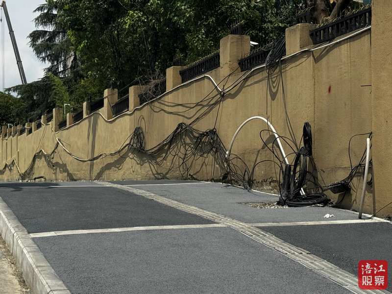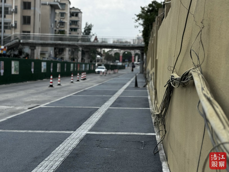 8月19日下午,記者來(lái)到施工現(xiàn)場(chǎng)看到,機(jī)動(dòng)車道正在進(jìn)行半幅施工,人行道區(qū)域已鋪設(shè)平整,煥然一新。然而,靠近外國(guó)語(yǔ)學(xué)校一側(cè)的墻面上,粗細(xì)不一、顏色各異的線纜或懸掛于墻、或成卷垂落在地,顯得十分凌亂。