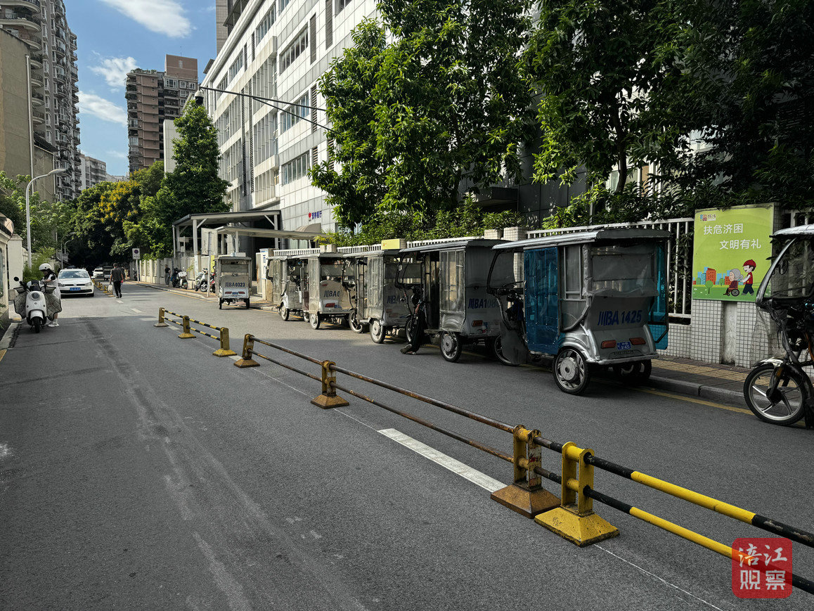 此外,在該路段靠近醫(yī)院西門的位置,記者還發(fā)現(xiàn)一整排逆向停放的待客三輪車,幾乎占據(jù)了一條車道。這一長期存在的現(xiàn)象與新增的隔離欄形成了疊加效應(yīng),進一步影響了通行效率。過往機動車行經(jīng)此處時,只得小心翼翼通行。