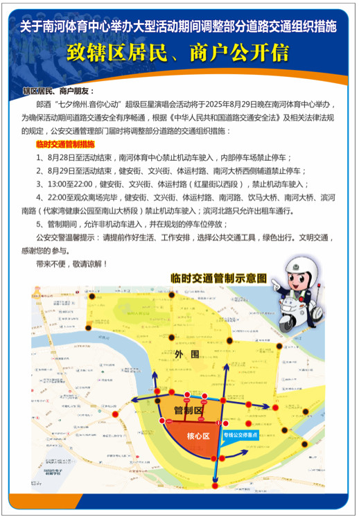 (二)8月29日至活動結束,健安街、文興街、體運村路、南河大橋西側輔道禁止停車;13:00至22:00,健安街、文興街、體運村路(紅星街以西段)禁止機動車駛入;
