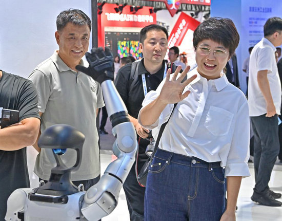 觀眾在2025全球工業(yè)互聯(lián)網(wǎng)大會(huì)現(xiàn)場與機(jī)器人互動(dòng)。新華社記者 周華 攝
