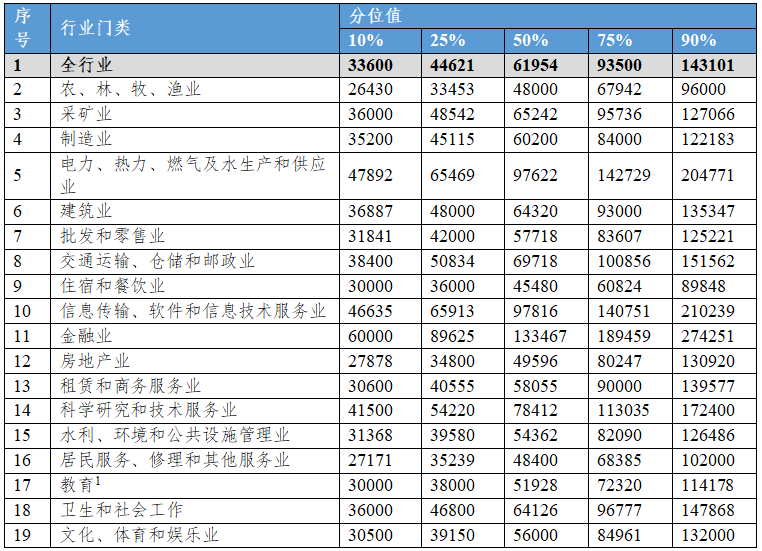從職業(yè)中類工資價(jià)位來看,中位數(shù)排名前五的職業(yè)是金融服務(wù)人員,信息傳輸、軟件和信息技術(shù)服務(wù)業(yè)人員,企業(yè)單位負(fù)責(zé)人,電力、燃?xì)饧八?yīng)服務(wù)人員,科學(xué)研究人員,分別為123660元/年、98000元/年、94420元/年、90071元/年、90000元/年。