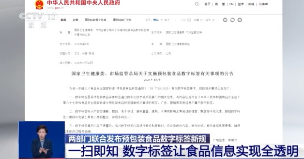 今后,這種情況要改變了,針對實體標簽版面有限的痛點,國家衛(wèi)生健康委、國家市場監(jiān)督管理總局,8日聯(lián)合發(fā)布《關(guān)于實施預包裝食品數(shù)字標簽有關(guān)事項的公告》,預包裝食品,就是指預先包裝或者制作在包裝材料和容器中的食品,我們?nèi)粘Y徺I的除了生鮮等,絕大部分食品都是預包裝食品。《公告》明確了預包裝食品數(shù)字標簽范圍、使用和修改等應用要求,這標志著我國食品標簽管理正式邁入數(shù)字化新階段。