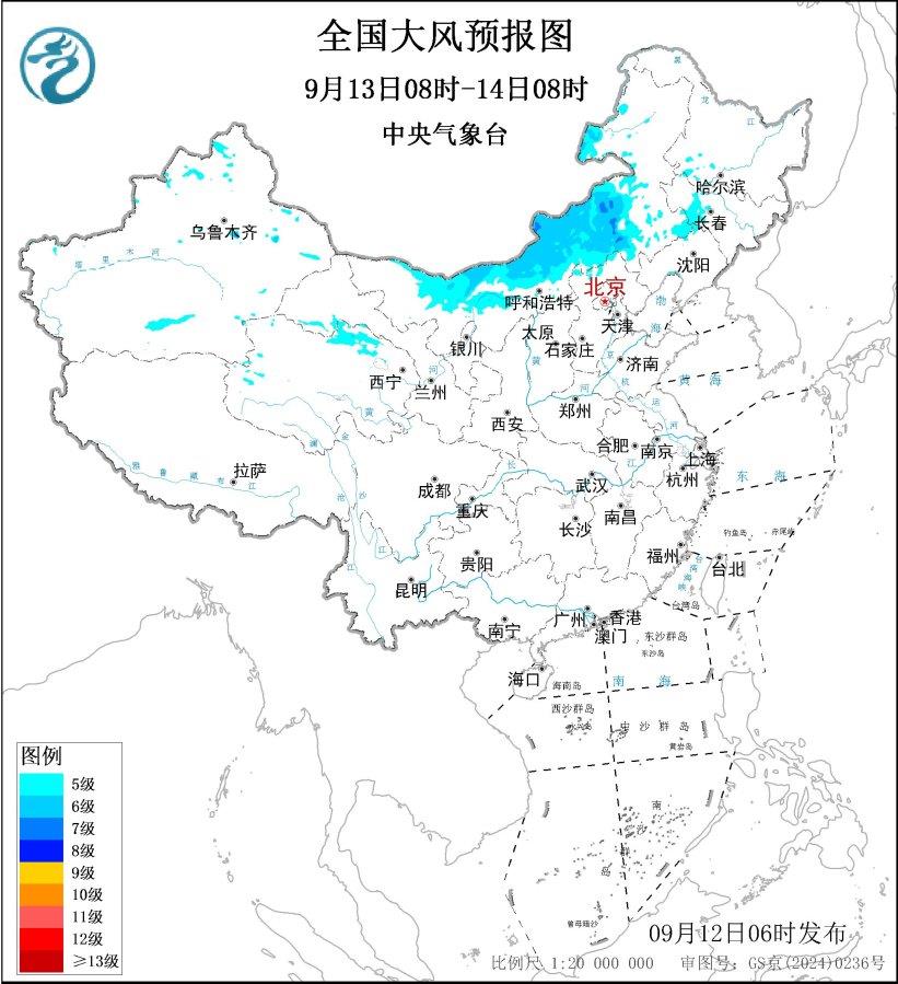 預(yù)計(jì),9月12日8時(shí)至13日8時(shí),新疆東部、甘肅西部、內(nèi)蒙古西部和東北部、黑龍江中南部、吉林中部等地部分地區(qū)將有4~6級風(fēng);黃海中部和南部海域?qū)⒂?~8級、陣風(fēng)9級的大風(fēng),其中部分海域風(fēng)力可達(dá)9級、陣風(fēng)10級。