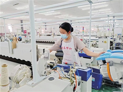 伴隨扎扎機(jī)聲,一匹匹光潔的布匹從端口流淌下來,經(jīng)過自動(dòng)化滾筒,形成一卷卷成品,這是三臺縣宜樂紡織科技有限公司車間的一幕景象。