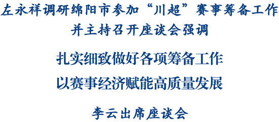 綿陽新聞網(wǎng)訊 四川省城市足球聯(lián)賽(“川超”)計劃于9月20日開賽,我市各項籌備工作正加快推進。9月18日,省委常委、市委書記左永祥前往三臺縣,調(diào)研綿陽市參加“川超”賽事籌備工作并主持召開座談會。他強調(diào),要深入貫徹習(xí)近平總書記關(guān)于體育的重要論述,全面落實黨中央和省委部署要求,扎實細致做好賽事籌備各項工作,多措并舉增強賽事舉辦綜合效應(yīng),以賽事經(jīng)濟賦能高質(zhì)量發(fā)展。市委副書記、市長李云出席座談會。