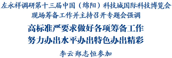 綿陽新聞網(wǎng)訊 第十三屆中國(綿陽)科技城國際科技博覽會將于9月26日至30日舉辦,目前各項籌備工作已進入沖刺階段。9月19日,省委常委、市委書記左永祥調(diào)研第十三屆科博會現(xiàn)場籌備工作并主持召開專題會。他強調(diào),要深入學(xué)習貫徹習近平總書記關(guān)于科技創(chuàng)新的重要論述,全面落實黨中央和省委部署要求,堅持系統(tǒng)觀念,加強協(xié)作配合,高標準、嚴要求做好第十三屆科博會各項籌備工作,努力辦出水平辦出特色辦出精彩。