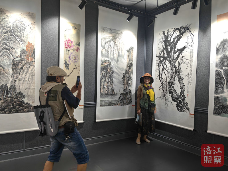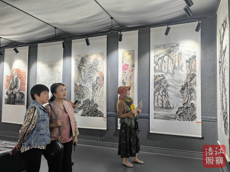 展覽現(xiàn)場,時(shí)有參觀者拿出手機(jī)在各自喜歡的作品前合影留念,有的與參展作者進(jìn)行藝術(shù)交流,畫家吳映強(qiáng)應(yīng)邀對(duì)展出作品的構(gòu)思、技法、內(nèi)容表達(dá)等進(jìn)行現(xiàn)場點(diǎn)評(píng),吸引了大家圍觀。