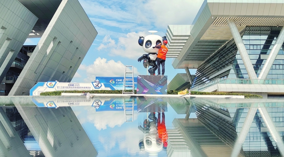 9月23日,工作人員正在會展中心安裝科博會形象大使“科寶”。
