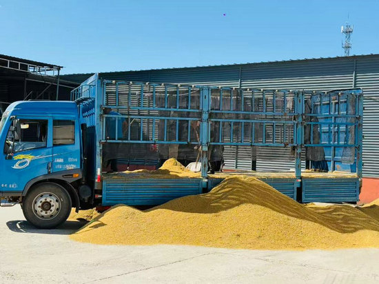 紅揚有機種植農(nóng)民專業(yè)合作社社員們正在將收獲的稻谷卸車。新華社記者孫曉宇 攝